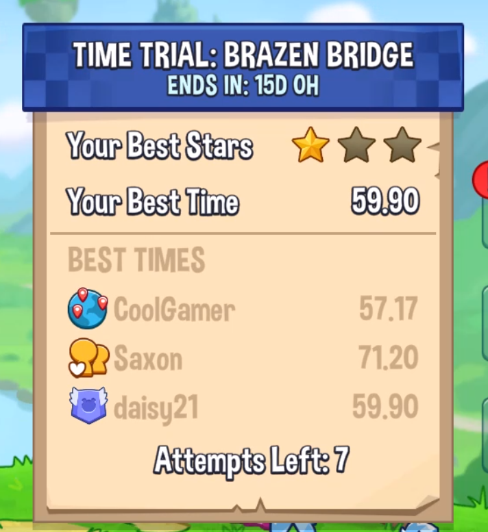 Each day you will get 5 attempts at taking on the current Time Trial map. You can unlock 10 additional attempts by watching an Ad. Make each run count!